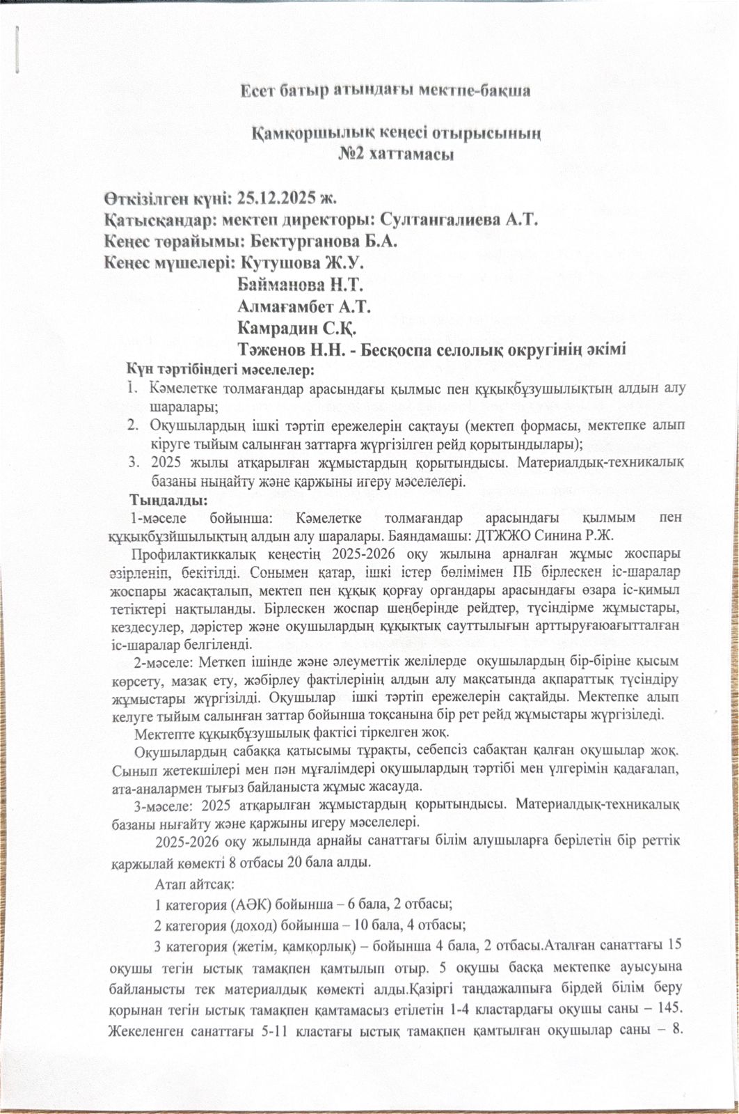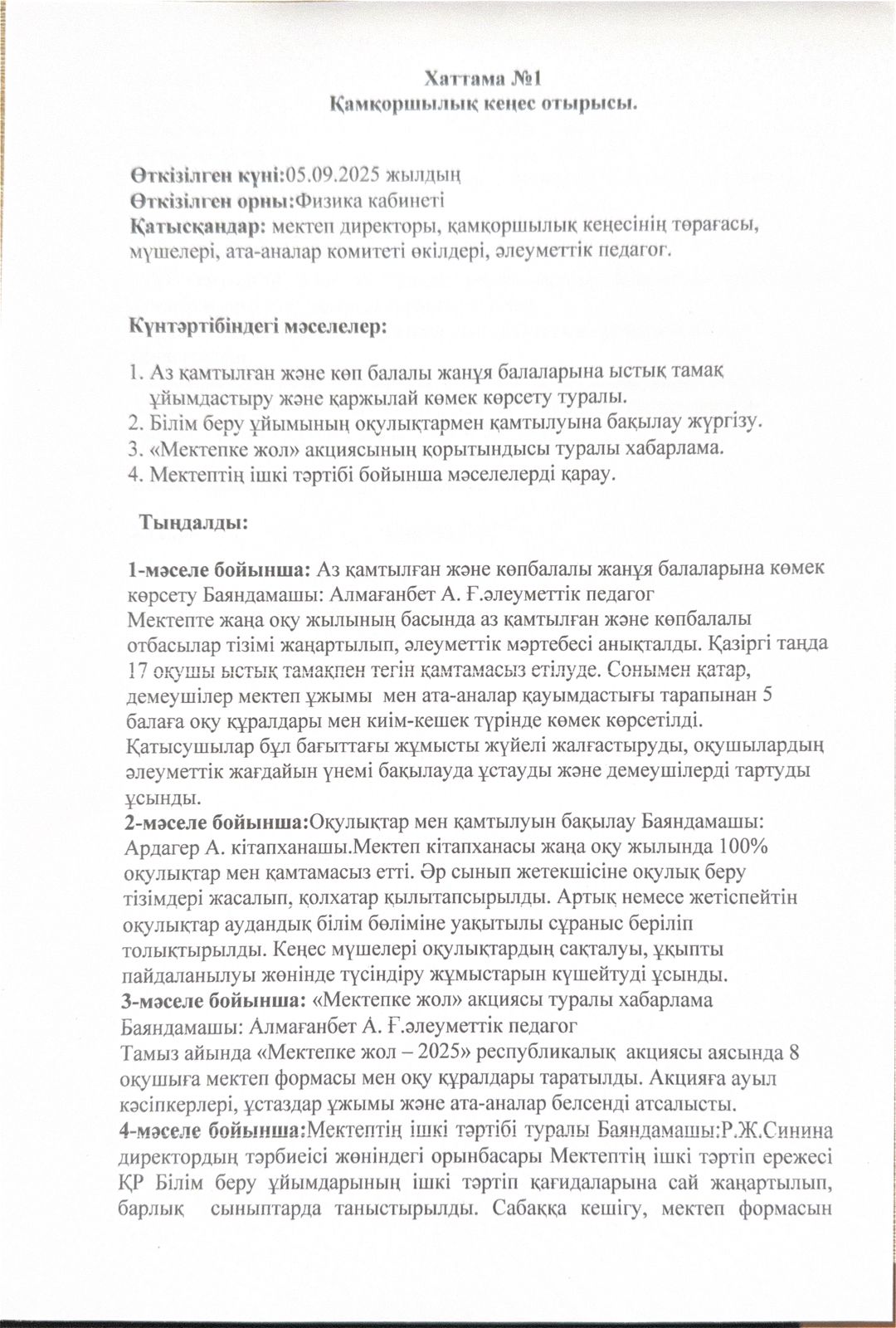 2025 - 2026 о.ж. Қамқоршылық кеңес отырысының №1 хаттамасы