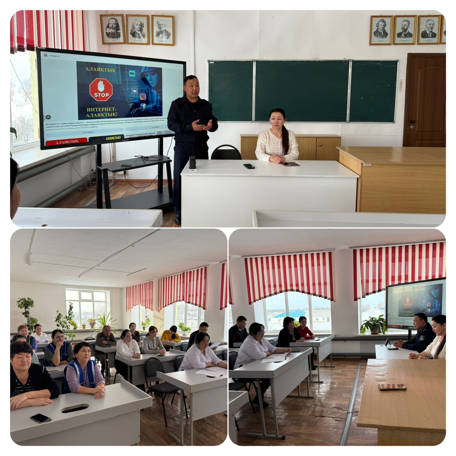 19.01.2026 жылы Алға ауданы Есет батыр атындағы мектеп-бақшасының мұғалімдері мен кіші қызметкерлеріне «Интернет алаяқтықтың» алдын алу мақсатында учаскелік полиция инспекторы полиция майоры С.Қ.Камарадин түсіндірме жұмыстарын жүргізді.